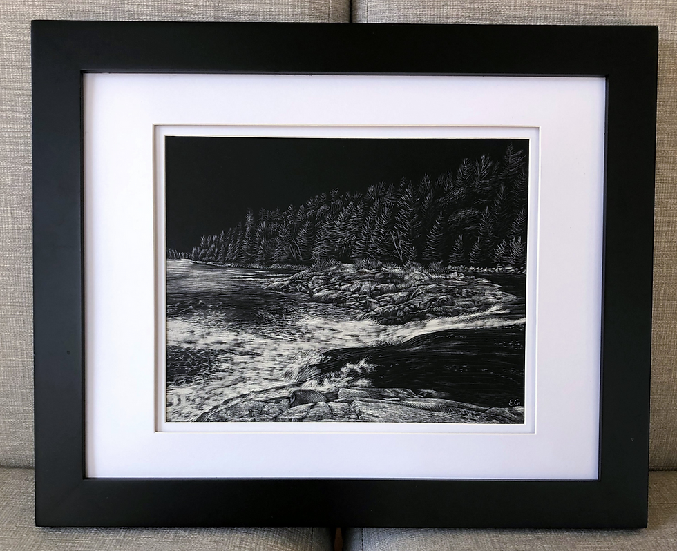 The art you see on my website, social media, and in person at markets all begins as a purely black board. You have that right, fully black. Scratchboard boards are a white clay board, but you don't see the white, at least not yet. Topped with a black ink, the artwork that is seen is created by scratching the board with an xacto knife, revealing a small white line with every mark. Over an over again, thousands upon thousands of times, the board is scratched, creating the image little by little.